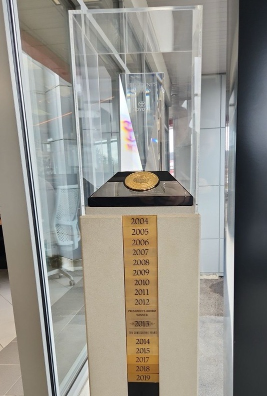 Toyota dealerships strive to match the quality of our products with the finest service in the industry. In order to qualify as a President’s Award winner, dealerships must excel in each of a series of categories, including customer sales satisfaction and customer service satisfaction. Dealerships which meet the requirements in all categories receive name badge recognition at all dealer events, national recognition in Automotive News and, of course, the beautiful President’s Award Tiffany crystal trophy. Visit us and experience what award winning service can mean to you!